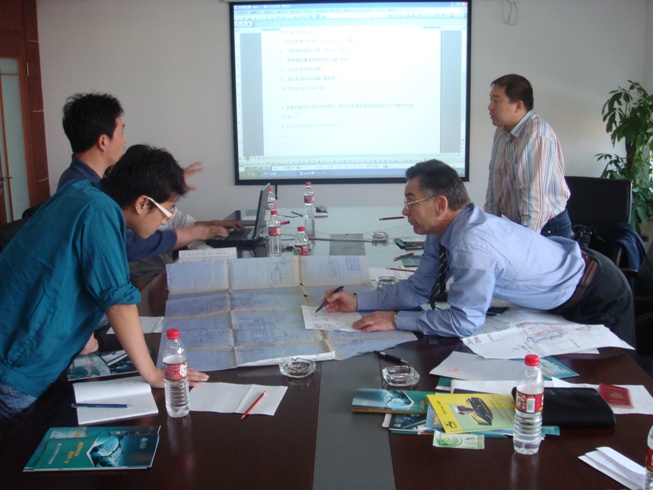 2008 год, г.Ханчьжоу. Генеральный представитель нашей компании в Китае г-н Тье Лей и главный инженер Алтайского тракторного завода обсуждают вопрос поставки двигателй с инженерами завода Sinotruk.